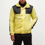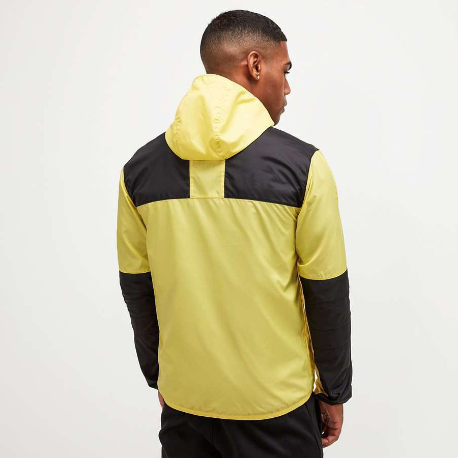 Seasonal Mountain Jacket in Yellow and Tail. Lightweight layering perfect for changing conditions during the warmer months, a lightweight polyester with a DWR coating provides light weather resistance. Two front pockets, drawstring hood and signature branding to left chest.